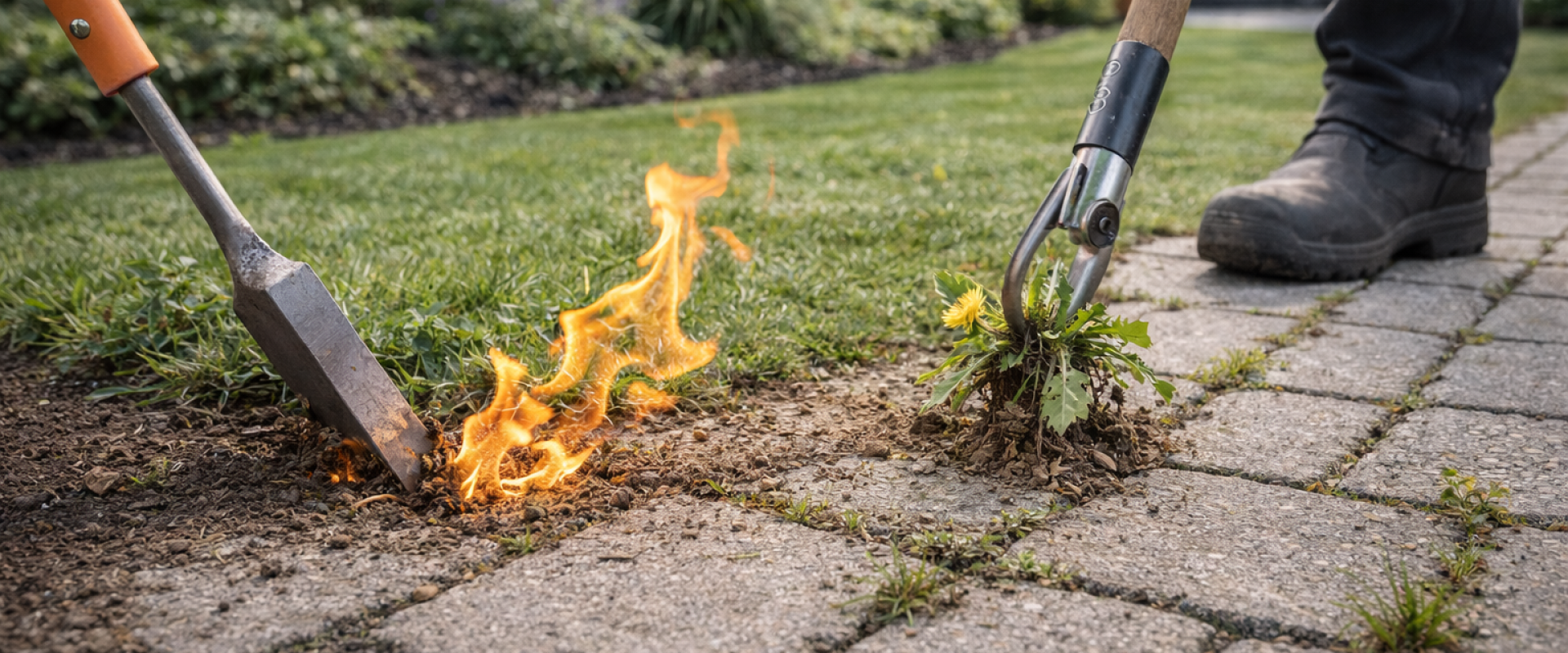 Metoden er effektiv på fliser og grusarealer, men kræver forsigtighed nær tør beplantning og bygninger.